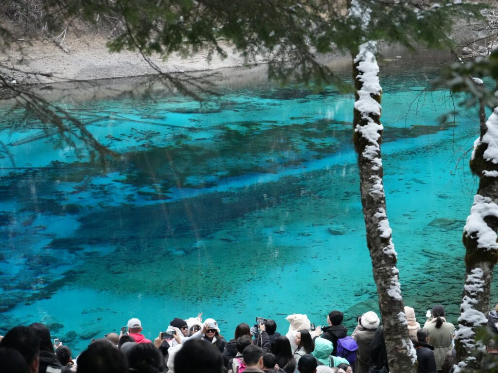By the time I was going from the Long Lake, it was already 3-4-ish PM and I continued my journey to the Five Coloured Pool. Despite its name, I only saw a blue-ish coloured lake. But I was still in awe, once again. It was probably the bluest lake I’ve ever seen. I spent another good amount of time there. While me and other visitors were there, there was a snowfall. I’ve seen snow before coming to China—while I was in India—but it was the first time I saw a snowfall. It was beautiful.